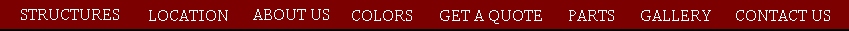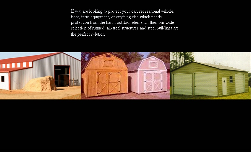 Our unique product set is not only limited to carports, enclosed garages, triple wide and 40' buildings. We are able to provide: * REMOTE CONTROLED ROLL-UP DOORS * 10' WIDE UP TO 40' WIDE CLEAR SPAN AND AS LONG AS YOU NEED IT * 14' LEG HEIGHT IF NEEDED * 12' WIDE ROLL-UP DOORS * TWO TONE COLOR SIDES AND ENDS * PRODUCTS CAN BE PURCHASED OVER THE TELEPHONE * FREE INSTALLATION ON YOUR LEVEL LAND * 13 COLORS & CUSTOM STYLES AVAILABLE |